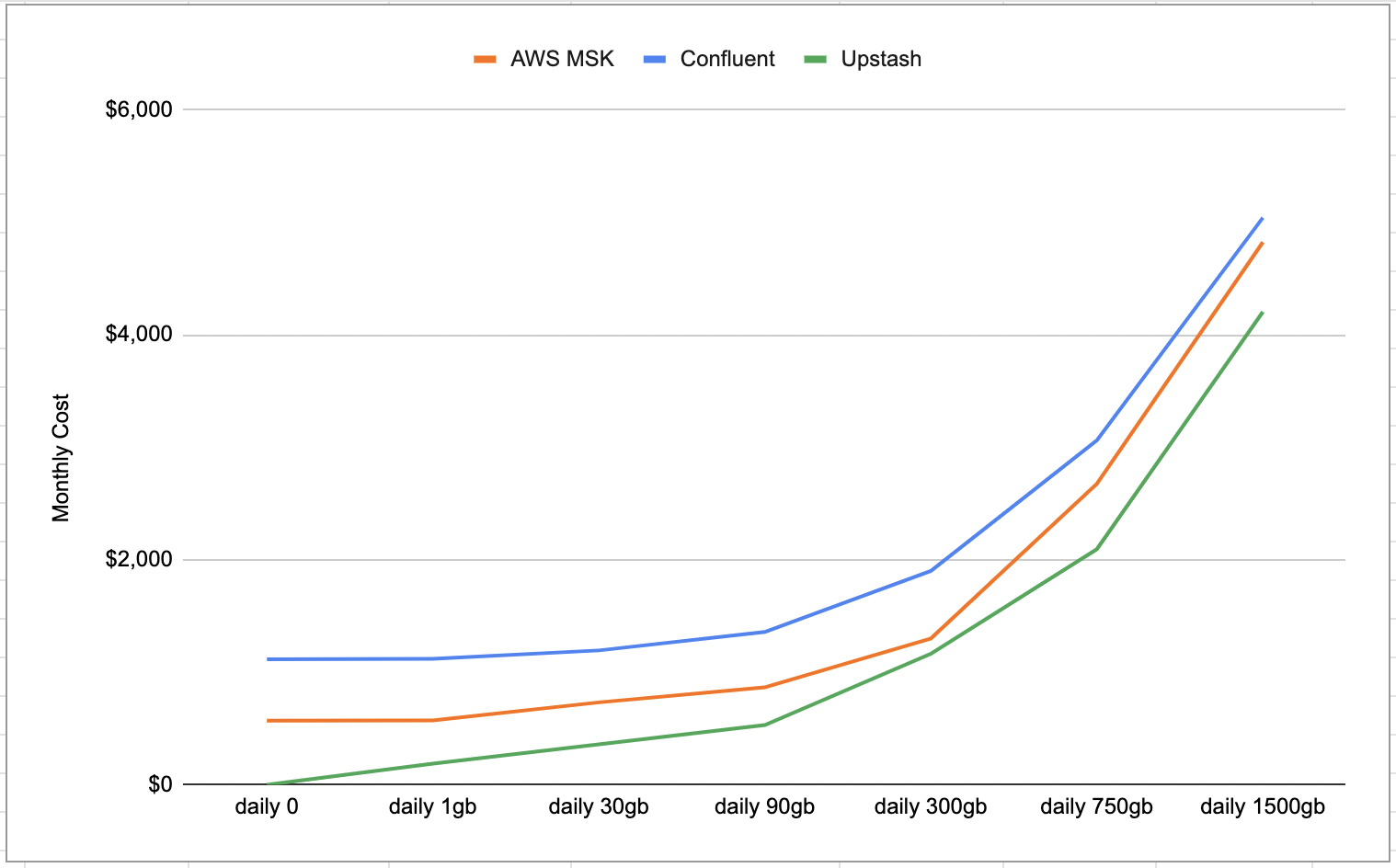 • AWS MSK and Confluent charges for an inactive, empty cluster. Upstash does not charge if your cluster is not active. The minimum costs: