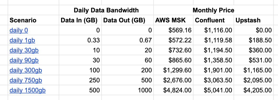 • Upstash pricing is based on per message. So we found the number of messages by dividing the bandwidth by the average message size. We assumed the average message size is 1Kb. For bigger values, Upstash’s cost will decrease. You can change this number on the spreadsheet for each scenario.