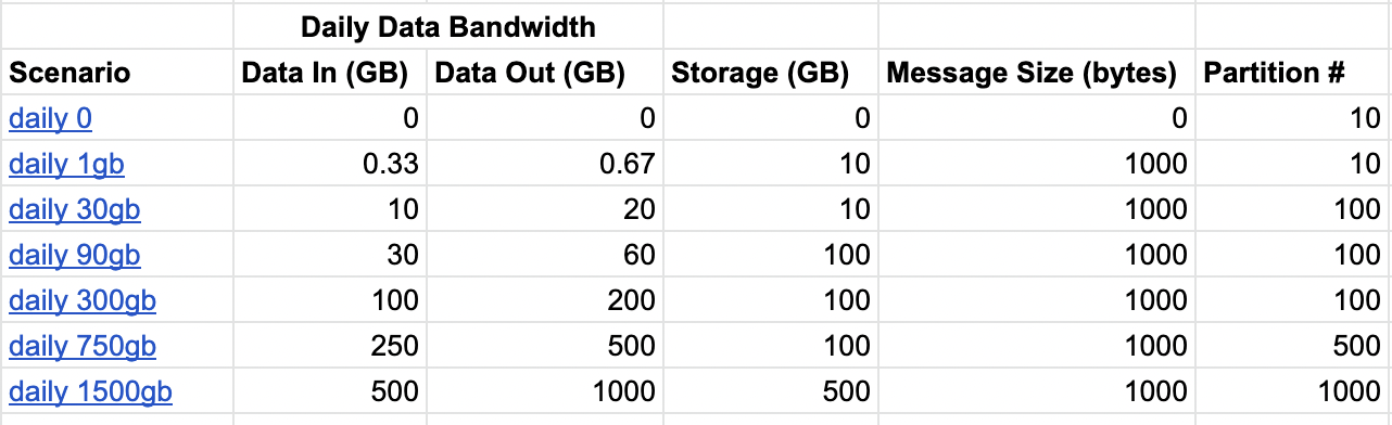 We will calculate the cost of each of 3 products for scenarios with different loads. Our scenarios will start from an empty cluster with zero bandwidth up to a cluster with a 1.5TB daily bandwidth. The below parameters will be an input variable for each scenario: