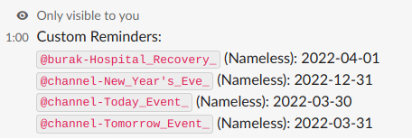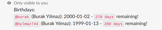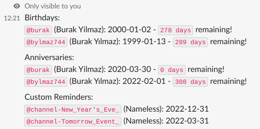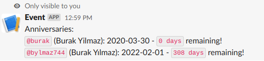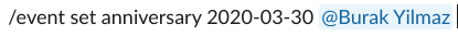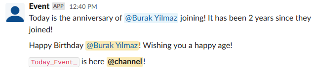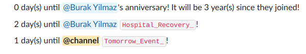 - Posts to the general channel once the event anniversary comes, mentioning the person in the center of the event (or everyone in the channel).