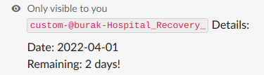 'text': "`{}` Details:\n\n Date: {}\nRemaining: {} days!".format(eventName, resultDict[0], resultDict[1])
