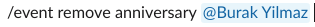 /event remove anniversary <user>:Removes the anniversary for the user, when they started working there.