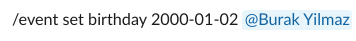 /event set birthday <YYYY-MM-DD> <user>Sets the birthday of the user.