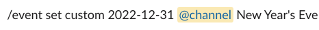 /event set custom <YYYY-MM-DD> <user> <any kind of message with whitespaces>Sets a custom reminder using the message provided.