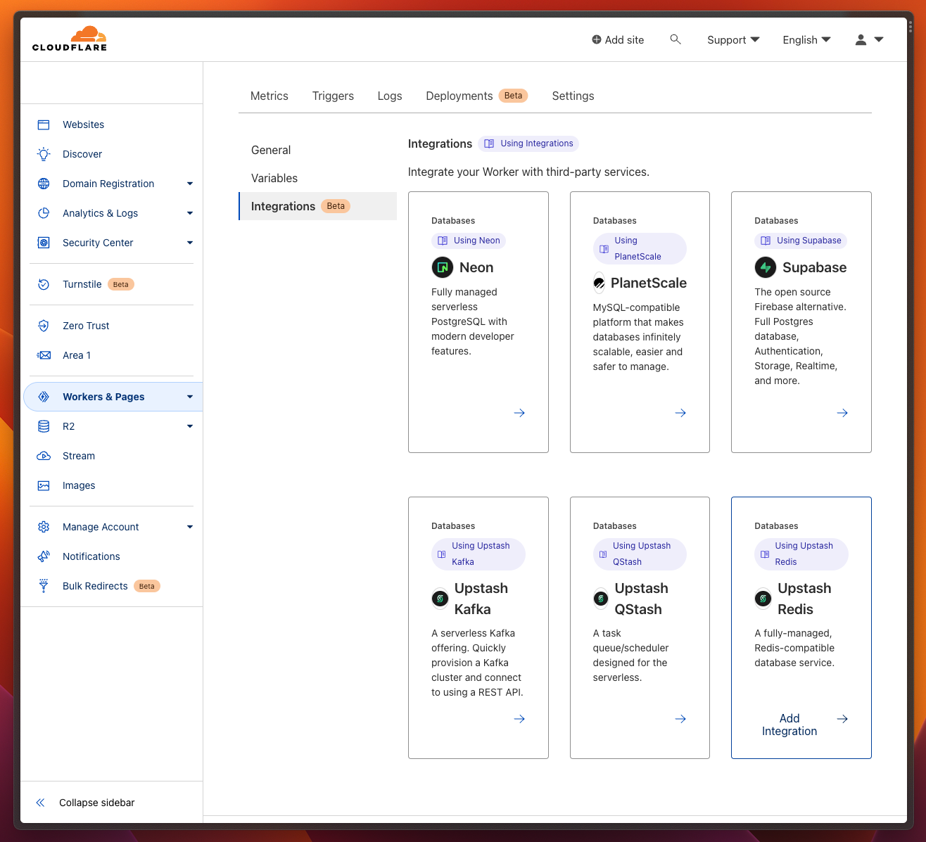 Clicking on the application will direct you to the application details page, where we will perform the integration process. Switch to the Settings tab in the application details, and proceed to Integrations section. You will see various Worker integrations listed. To proceed, click the Add Integration button associated with the Upstash Redis.