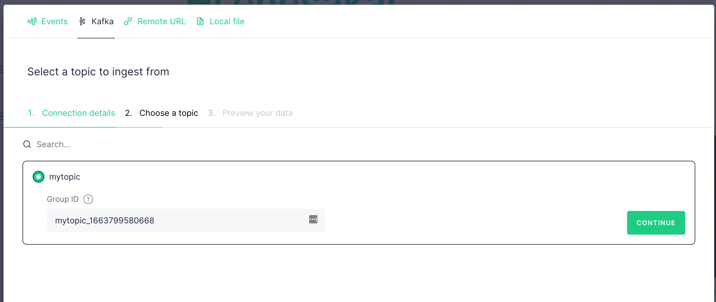 If the connection is successful, then you should see the topic you have just created. Select it and click Continue .