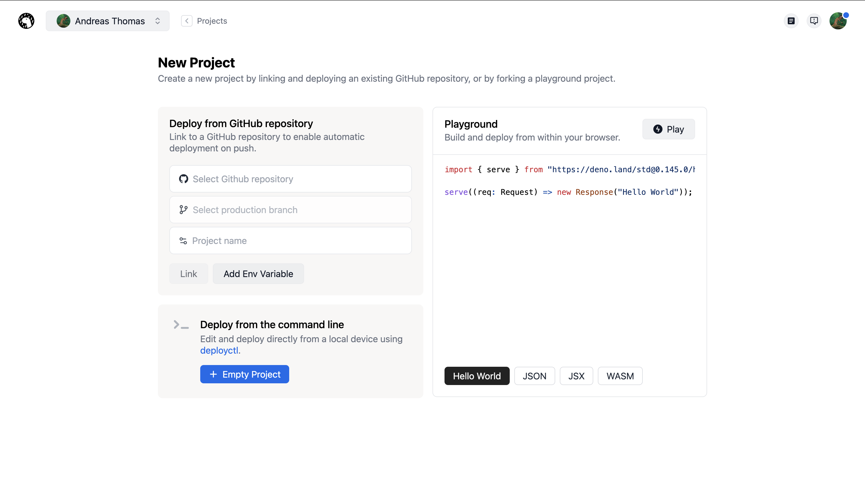 Go to dash.deno.com/new and create a new playground project by clicking on Play