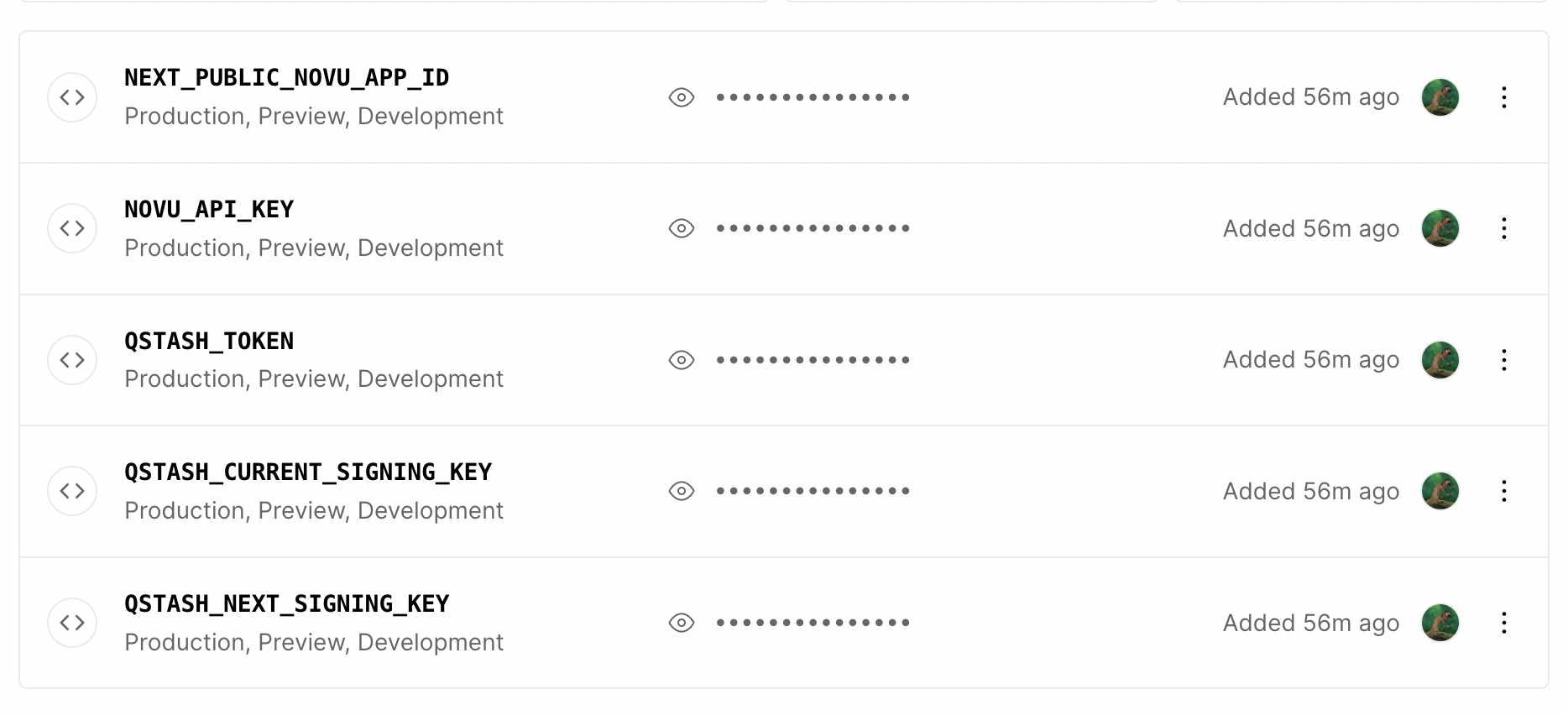 QSTASH_TOKEN,QSTASH_CURRENT_SIGNING_KEYandQSTASH_NEXT_SIGNING_KEYvariables. You'll need these later. - Create a new notification template in novu