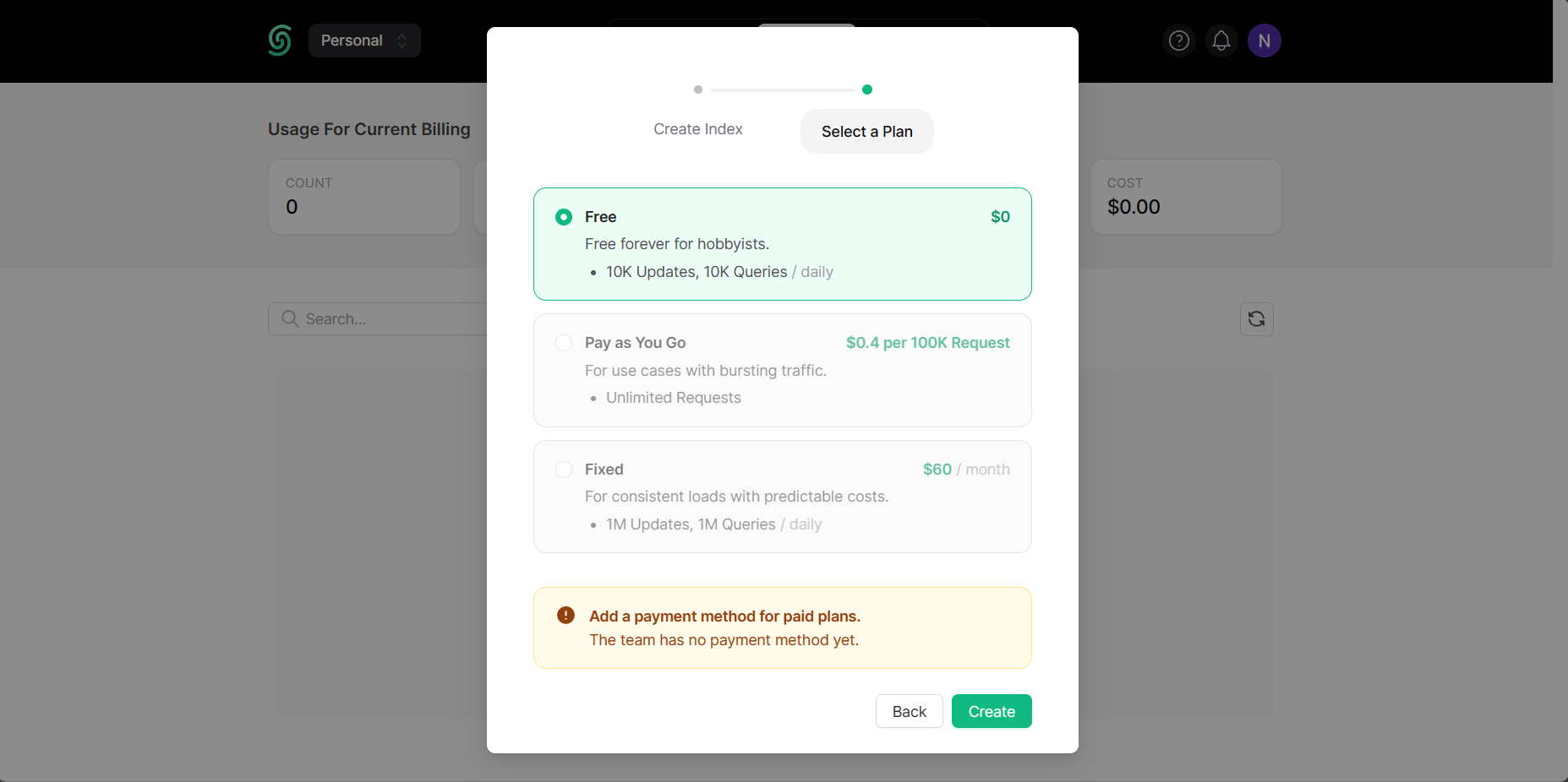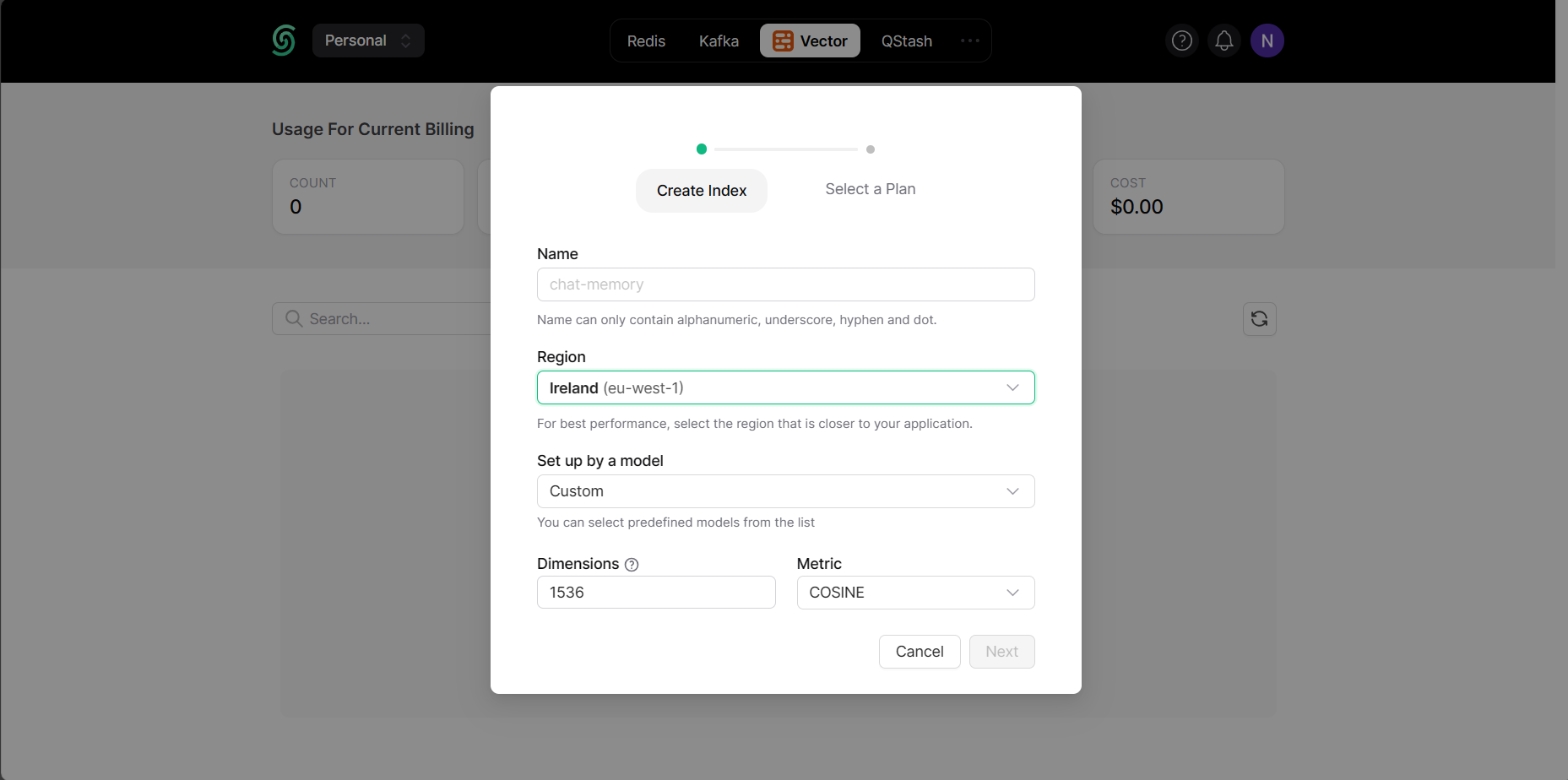 Navigate to Upstash Console and create an account if you don't have already. Then, login to your account and go to Vector using the bar at the top of the page. After that click Create Index.
