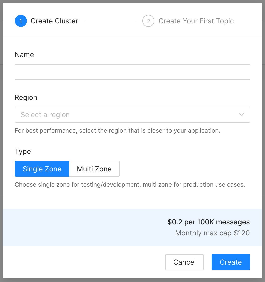 If you don’t already have an Upstash account, you can sign up here. You’ll see the Upstash console afterward. Select the Kafka tab at the top. Now, you need a Kafka cluster. Click the Create Cluster: