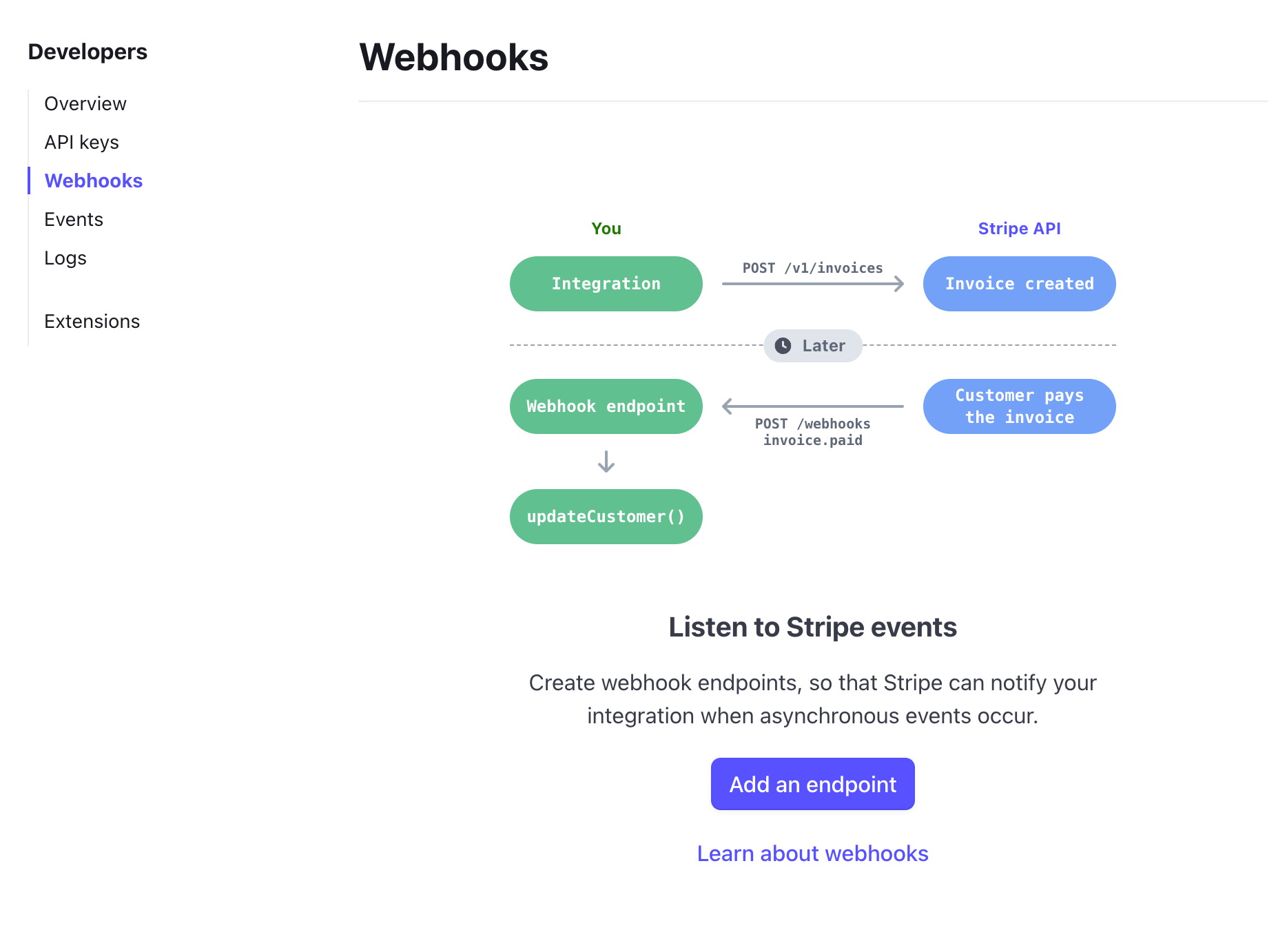 Sign in to your Stripe account, then click the Stripe Webhook page (Developers > Webhooks). Click the Add an endpoint button.