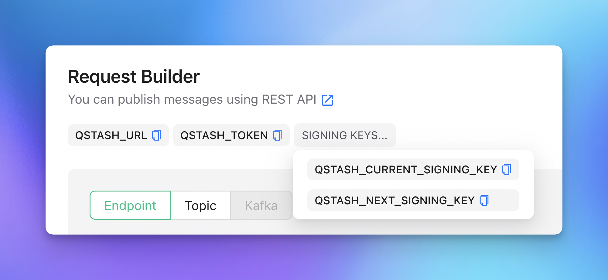 In the Request Builder section, there are 2 environment variables ready to be copied: