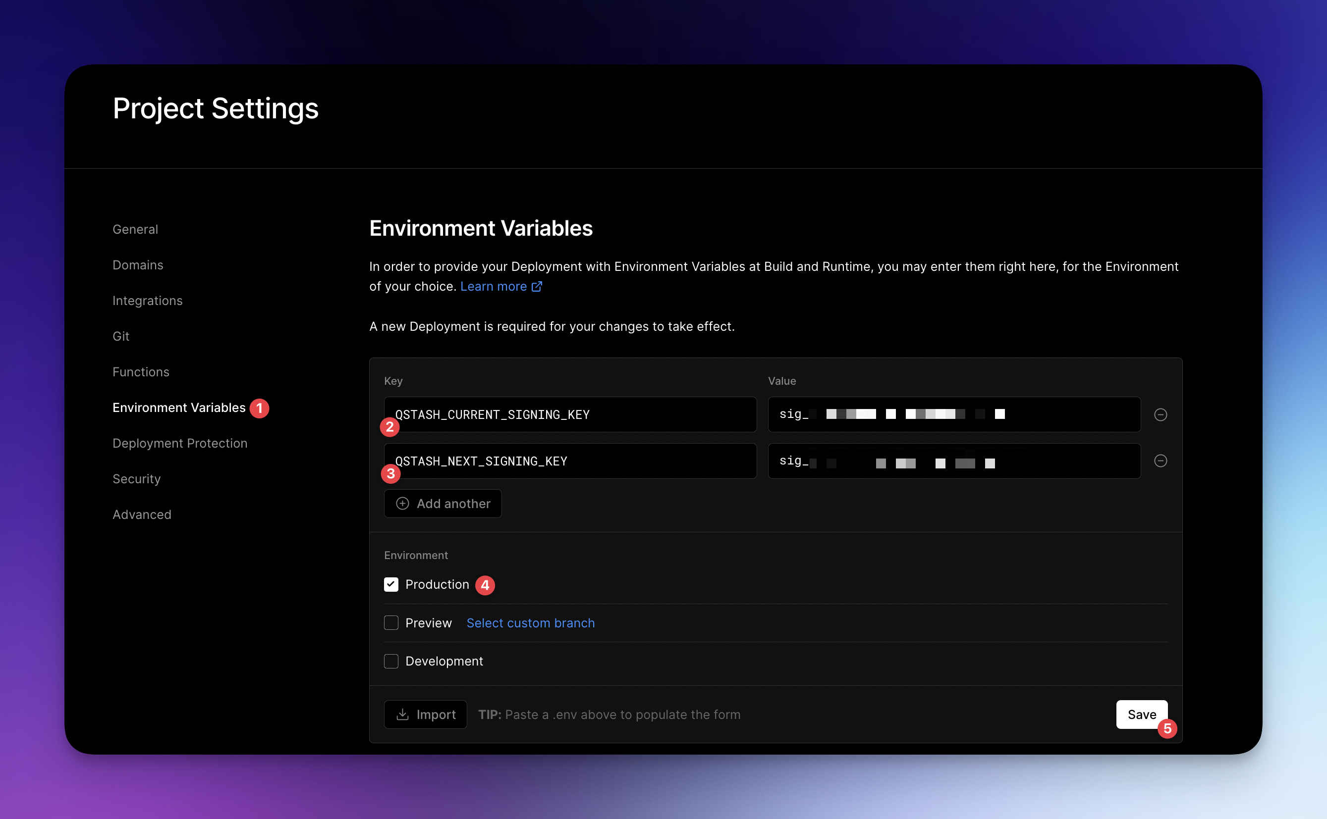 Once you have those variables, you can add them to your Vercel project.