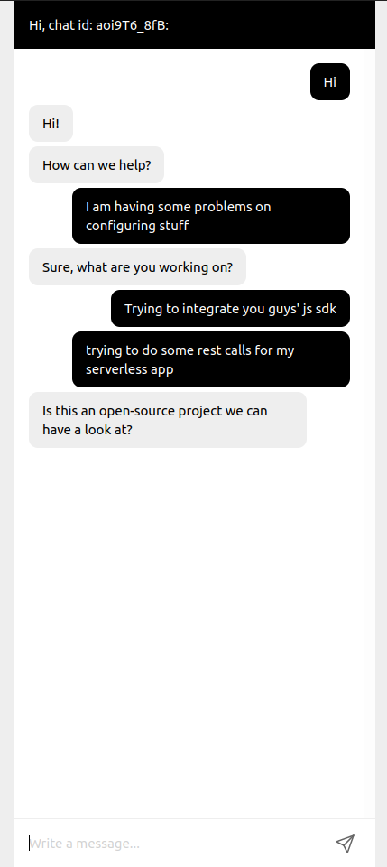 Notice that chat id is shown in the console. Note that and go to /chat/{id} to see the admin panel and how both interfaces interact with each other.